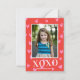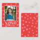 Este cartão com fotos moderno e doce da sala de aula de Namorados apresenta um padrão de fundo de corações cor-de-rosa em um fundo vermelho, XOXO em larga escala e uma foto vertical. A parte traseira do cartão tem o mesmo padrão cardíaco, que pode ser removido se desejado. Você também pode adicionar outra foto ao verso e/ou texto adicional ao verso. Este tamanho pequeno é perfeito para trocas de Namorados em sala de aula!