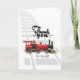 Encerrar uma festa de aniversário nunca foi tão fácil quanto com este cartão dobrado divertido. O design apresenta uma clássica locomotiva a vapor em vermelho e preto ousado sentada em cima de trilhos cinzas desbotados que dão uma sensação de movimento legal. Logo acima do trem, uma fonte moderna em preto com letras cursivas escreve um grande "Obrigado" que chama a atenção instantaneamente. Abaixo da ilustração, há uma linha impressa simples para adicionar uma nota curta e doce sobre o presente. É a maneira perfeita e sem estresse de enviar um acompanhamento elegante e correspondente a todos os amigos e familiares que vieram celebrar sua festa temática de trem.
