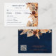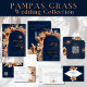 Um cartão de cerimônia de casamento moderno, impressionante, que inclui elementos de vassoura de erva pampas em terra terracotta, matizes rústicos com fundo azul marinho. Adicione o URL do seu site de casamento no verso do cartão e o código QR será atualizado ou apagado se não for necessário. Personalize com seus próprios detalhes usando os modelos de texto.