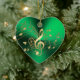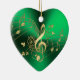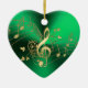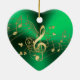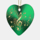 Notas Dourados da música do coração verde e enfeites de natal do Clef. Uns funcionarios do fluxo do ouro de notas musicais e de clef de triplo em um fundo metálico do verde do Natal. Um grande presente este feriados para seu amante favorito do músico ou da dança.