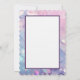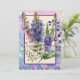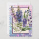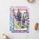 Lindos caules de Delfinium, azuis e roxos, sobre um fundo emoldurado de amarelo e roxo e um fundo de um design cor-de-rosa, azul e roxo.