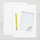 Este design é um bloco de notas e um lápis. É um bloco de anotações alinhado com o canto da página superior dobrado. Não no bloco de notas há um lápis amarelo. Está tudo pronto para começar a escrevendo. Este bloco de notas e design de lápis parecem excelentes nestes convites