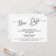 A distinção deste conjunto se deve à fonte de texto elaborada e com curvas usada para as frases de destaque. Caso você precise informar aos seus convidados que o seu casamento foi adiado, este cartão oferece uma opção elegante. Nesta peça, a fonte de caligrafia foi usada para criar um gráfico que representa as palavras "Nova Data". Use os campos do modelo para adicionar seus detalhes pessoais e tornar este design único. O fundo pode ser alterado para qualquer cor que você preferir. Por favor, entre em contato para qualquer solicitação especial ou para obter ajuda na personalização. // 98 //