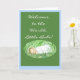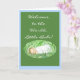 Um cartão de boas-vindas para um bebê novo, com um bebê dormindo e uma inscrição branca num fundo verde escuro, borrado com azul.