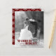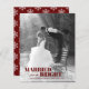 Celebre seu primeiro Natal junto com este lindo cartão de férias orçamentário. A design apresenta as palavras "Casado e Brilho" com sua foto. Adicione sua própria mensagem pessoal. A carta se inverte para um padrão de floco de neve em um fundo vermelho.