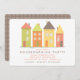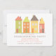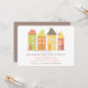 Um design divertido apresenta uma fileira de pequenas casas doces em tons alegres de verde, laranja e marrom nesta tomada contemporânea sobre o tema do Partido do Aquecimento Doméstico.