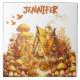 Traga um toque caprichoso para a sua cozinha ou área de jantar com este azulejo de cerâmica, com um design de núcleo de ouro sobre fundo branco. A intrincada cena de casas acolhedoras, cogumelos brincalhões e pássaros em voo cria um ambiente sereno e encantador. Personalizado com o seu monograma, este azulejo combina o encanto rústico com um toque personalizado. Perfeito para uso decorativo e funcional, ele adiciona um elemento exclusivo de estilo e praticidade ao seu decoro doméstico.
