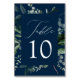 Cartões de mesa de casamento elegantes e botânicos com o número da tabela aninhados em um quadro retangular cercados por eucalipto, samambaias e outros ricos verdes com fundo marinho. Personalize o número de cada placa de mesa e adicione-o ao seu carrinho. Projetado para coordenar com nossa coleção de casamento Abundant Greenery.