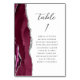 A borda esquerda deste elegante cartão de número de mesa de casamento moderno apresenta uma borda de ágata em vermelho borgonha com pintura à água e acabamento em brilho prateado falso. A palavra "mesa" aparece em escrita à mão em cinza carvão sobre um fundo branco. Adicione os nomes dos seus convidados que estão atribuídos a cada mesa.