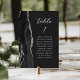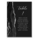 A borda esquerda desta elegante e moderna placa de número da mesa de casamento apresenta uma coloração aquosa preta, aparada com falso brilho prateado. A palavra "mesa" aparece em um guião de escrita manual de cinzas prateadas sobre fundo preto. Adicione os nomes dos seus convidados que estão atribuídos a cada mesa.