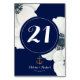 O número náutico da tabela da Boutique Co. náutica apresenta anêmonas brancas em cascata sobre um fundo azul marinho. O design é acentuado com uma âncora correspondente, os nomes da noiva e do noivo (ou o nome do evento — é personalizável) e a data do evento. #Náutico #Casamento #Anêmonas #BoldFloral