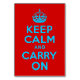 Um design clássico do estilo "Manter Calmo e Continuar" com cores modernas de vermelho e aqua.
