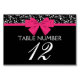 Esta placa numérica da tabela apresenta um padrão de rosa elegante preto e branco, um arco rosa quente e um texto branco sobre um fundo preto. Está impresso em ambos os lados.