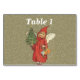 Este cartão de mesa para suas festas ou eventos é marrom-claro com flocos de neve em queda e uma menina anjo vitoriana com cabelo louro vestindo uma capa vermelha capuz segurando uma árvore de Natal acesa com velas. Personalize seu número de tabela com o modelo.
