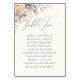 Cartão 'mesa dois' de casamento floral azul desbotado e creme com letra elegante e um modelo de texto para os nomes dos convidados.
