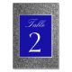 Escrito simples e moderno da caligrafia, elegante prata brilhante e número da mesa azul real. Escolha perfeita para casamentos no inverno de vidro contemporâneo!