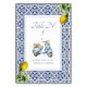 Cartão de número de mesa de casamento com limão mediterrâneo na Itália, Costa Amalfitana, com azulejos azuis, limão e moldura azul. Basta alterar com seu nome, número e data.