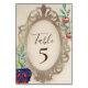 Esta carta de número de tabela de festas encantadora apresenta um tema de conto de fadas Branca de Neve. A imagem de uma maçã venenosa é impressa no canto inferior esquerdo, com uma ramificação de maçãs vermelhas brilhantes impressa no canto superior direito. Um espelho grande do ouro é colocado no centro com as informações da parte. O fundo apresenta um estilo rústico, design de papel pergaminho para se assemelhar a um livro de conto de fadas antigo.