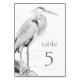 Esta placa de número da mesa de casamento apresenta um desenho do estilo do lápis de um lindo Herão Azul Excelente em cima de rochas com vista para a água. Tudo feito em tons de cinza e branco.
