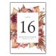 Placas florais de números de mesas de casamento elegantes, desérticas, com flores de borboleta, púrpura, pincel e coral e folhagem exuberante em tons ricos de terra marrom. Personalize adicionando o número da tabela, seus nomes, data do casamento, etc. Design repete-se no lado oposto. Coordena-se com a nossa suíte de convite de casamento Boho Desert Floral.