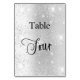 O número da tabela é escrito com um script de estilo elegante com letra manual. Letras negras, um fundo de prata sujo com poeira brilhante falsa, faíscas.