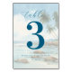 This wedding table card features a serene beach scene with soft pastel colors, creating a tranquil and inviting atmosphere. The design includes gentle waves, palm trees, and a clear sky, all rendered in a watercolor style that adds to the relaxed vibe. A large numeral "3" is prominently displayed in bold teal, complemented by elegant cursive typography for the word "table." The minimalist layout focuses on natural elements, making it perfect for a romantic seaside-themed event.