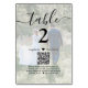 Adicione um toque de acabamento personalizado a decorações de recepção de casamento com cartões personalizados de números de tabela de foto e código QR. As imagens e todo o texto são simples de personalizar e podem ser diferentes ou iguais em frente e atrás. Se preferido, mude "capturar o amor" para "fundo da lua de mel", "obrigados especiais", "menu", "nossa história de amor" ou outro texto de sua escolha. (DICA DE IMAGEM: Uma maneira fácil de centralizar uma foto exatamente como você deseja é recortá-la antes de carregá-la no site do Zazzle.) Ao digitalizar o código QR com sua câmera telefônica, os convidados são enviados diretamente para um site de casamento ou outro local online com qualquer informação importante/divertida, como uma mensagem de vídeo, um aplicativo de pagamento digital ou uma página de mídia social. O design branco e preto de dois lados apresenta uma tipografia moderna minimalista, caligrafia manuscrita, 2 códigos QR personalizados e suas fotos. Essas elegantes e únicas cartas de números de tabela fazem na moda a uma celebração especial. Foto de exemplo na frente é de Tim Stagge no Unsplash.