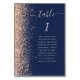A borda esquerda desta elegante e moderna carta de números da mesa de casamento apresenta uma borda falsa de pêssego. A palavra "mesa" aparece em um guião branco de pêssego em um fundo azul marinho. Adicione os nomes dos seus convidados que estão atribuídos a cada mesa.