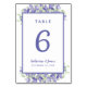 Um modelo para qualquer número, este elegante projeto de número de mesa de casamento com flores em aquarela apresenta um clássico design de jardim botânico com tons elegantes de flores azuis pervinca com folhagem verde exuberante e suave em um fundo branco crocante. Personalize o design da mesa de casamento com seus nomes, data do casamento e número da mesa em letras e caligrafia da moda. O verso do cartão é uma duplicata da frente. Personalize facilmente e encomende um para cada mesa com os números individuais das mesas.