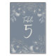 Simples, elegante, vintage, número da mesa azul poeira floral com renda de flores silvestres de pervinca sofisticada.