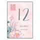 Este contemporâneo cartão de número da mesa de casamento chinesa apresenta uma flor de lótus pintada a aquarela e um símbolo duplo seis cor-de-rosa em um fundo de aquarela rosa.