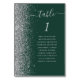 A borda esquerda desta elegante e moderna placa de número da mesa de casamento apresenta uma borda cintilante de falso prateado. A palavra "mesa" aparece em uma escrita branca de cinza prateada num fundo verde escuro. Adicione os nomes dos seus convidados que estão atribuídos a cada mesa.