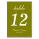 Um número de mesa de casamento simples para um esquema de cores de casamento verde oliva. É apenas texto branco em um fundo verde oliva. Tudo, exceto o próprio número, é escrito em uma elegante escrita caligráfica.