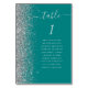 A borda esquerda desta elegante e moderna placa de número da mesa de casamento apresenta uma borda cintilante de falso prateado. A palavra "mesa" aparece em cinza prateada, escrita à mão, sobre fundo azul lacrimogêneo. Adicione os nomes dos seus convidados que estão atribuídos a cada mesa.