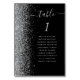A borda esquerda desta elegante e moderna placa de número da mesa de casamento apresenta uma borda cintilante de falso prateado. A palavra "mesa" aparece em cinza prateada e escrita à mão em fundo preto. Adicione os nomes dos seus convidados que estão atribuídos a cada mesa.
