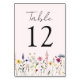 Placas florais elegantes de números de mesas de casamento com flores silvestres e folhagem de cor d'água em tons cor-de-rosa, amarelo, roxo, azul e verde que fazem fronteira com o fundo do design num fundo cor-de-rosa. O design repete atrás. Os cartões de mesa de casamento rústicos de flor silvestre são perfeitos para casamentos de primavera e verão. Para solicitar as placas de mesa: adicione cada número ao carrinho individualmente e faça check-out quando terminar.
