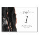 A borda esquerda desta elegante e moderna placa de número da mesa de casamento apresenta uma coloração aquosa preta, borda cortada com falso rosa dourado. O texto personalizável combina a escrita manual de cinzas de carvão, e as fontes itálicas e em placas em um fundo branco.