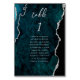 Este cartão de número de mesa de casamento moderno e elegante apresenta um fundo de ágata em aquarela azul turquesa aparado com brilho de prata falso. A palavra "mesa" aparece em escrita à mão em cinza prateado. Adicione os nomes dos seus convidados que estão atribuídos a cada mesa.