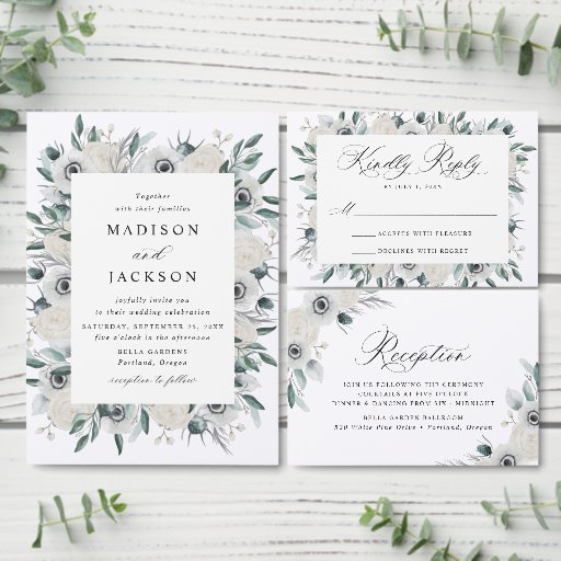 Cartões de números de tabela florais elegantes, com o número da tabela, seus nomes e data de casamento moldados por anêmonas brancas de aquarela, rosas de marfim e folhas verdes de sábio escuro. O design repete-se no verso. Projetado para coordenar com nossa coleção de casamento de Anêmonas Brancos e Rosas. Para solicitar este design, personalize os números de tabela um a um e adicione-os ao carrinho individualmente.
