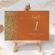 A borda esquerda deste elegante número da mesa de casamento moderna apresenta um design dourado faux glitter. O texto personalizável combina manuscrito pálido de cor dourada, fontes copperplate e itálico em um fundo laranja queimado.