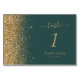 A borda esquerda deste elegante número da mesa de casamento moderna apresenta um design dourado faux glitter. O texto personalizável combina manuscrito pálido e dourado, fontes em copperplate e itálico em um fundo verde escuro.