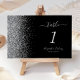 A borda esquerda deste elegante número da mesa de casamento moderna apresenta um design de cintilação. O texto personalizável combina a escrita manual de cinzas prateadas, fontes copperplate e itálico em um fundo preto.