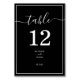 Cartões simples, modernos e elegantes de mesa a preto fazem um toque formal na sua recepção de casamento. Personalize cada número de tabela, seus nomes e datas de casamento em letras caligráficas e serif delimitadas por linhas brancas. Esta é parte da nossa coleção de monogramas preto e branco.