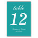 Um simples número da mesa de casamento para uma cor de casamento. É apenas um texto branco sobre um fundo azul lacrimogêneo. Tudo, exceto o número em si, é escrito em um roteiro caligráfico elegante.