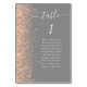 A borda esquerda desta elegante e moderna carta de números da mesa de casamento apresenta uma borda falsa de pêssego. A palavra "mesa" aparece em um guião branco de escrita manuscrita em fundo de cinza. Adicione os nomes dos seus convidados que estão atribuídos a cada mesa.