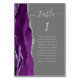 A borda esquerda desta elegante e moderna placa de número da mesa de casamento apresenta uma cor d'água roxa, borda agitada com falso brilho prateado. A palavra "mesa" aparece em um guião de escrita manual de cinzas prateadas em fundo de cinza. Adicione os nomes dos seus convidados que estão atribuídos a cada mesa.