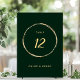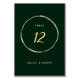 Este número da mesa de casamento apresenta uma falso estrutura em círculo dourado e uma caligrafia simples com um fundo verde da floresta.