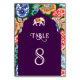 Elegante número da mesa de casamento com um belo arco e trabalho de arte colorido.