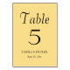 Guie seus convidados de recepção de casamento para a mesa com esta placa de número de tabela de estilo simples que apresenta letras pretas e estilizadas em um plano de fundo de cor amarelo de manteiga e de tendência. Design está em cada lado da placa. Edite seu cartão para alterar o número da tabela, os nomes dos casais de casamento e a data. Cartões de pedido separados para cada número de tabela.