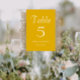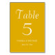 Guie seus convidados de recepção de casamento para a mesa com esta placa de número de tabela de estilo simples que apresenta letras brancas e estilizadas em um plano de fundo de cor amarelo de ouro e de tendência. Design está em cada lado da placa. Edite seu cartão para alterar o número da tabela, os nomes dos casais de casamento e a data. Cartões de pedido separados para cada número de tabela.
